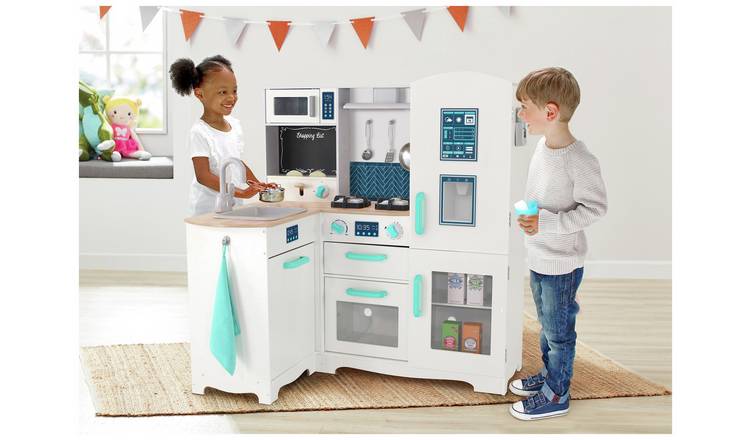 Packed with fun features such as a sink an oven with shelf and a washing machine with opening doors and clicking dials this great play kitchen is the perfect way to get children engaged with everyday tasks from a young age. Argosie has thousands of fantastic products for you to choose from across thirteen online categories. Play-Kitchen-for-Kids with 18 Pcs Toy Food Cookware Accessories Playset Wooden Chef Pretend Play Set for Toddlers with Real Lights Sounds 47 out of.